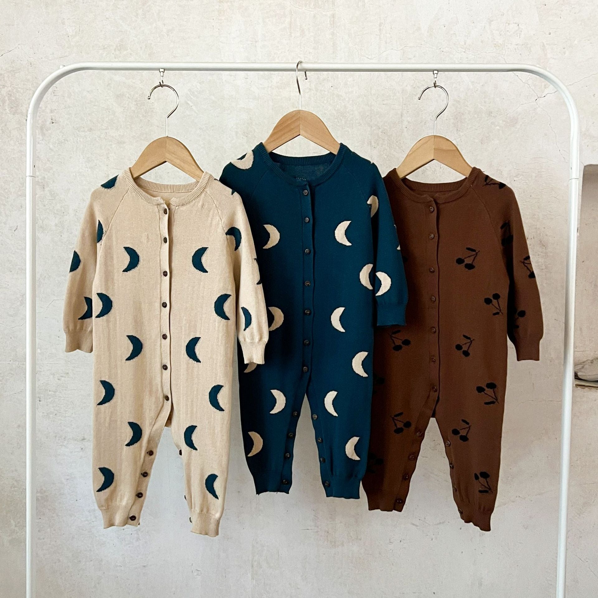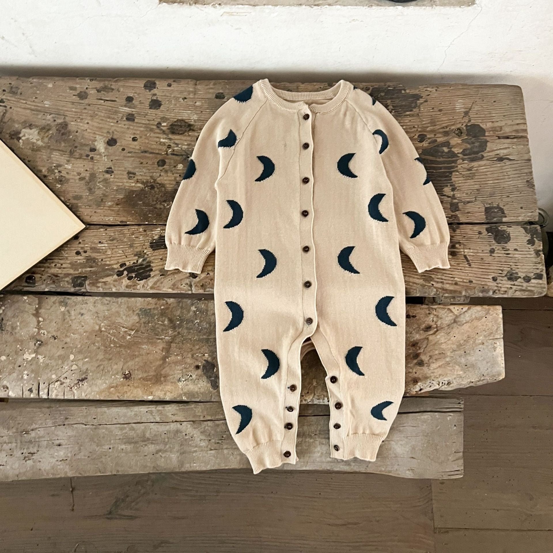 Our Button Front Knit Jumpsuit is a great versatile piece for your little one. This cozy knit jumpsuit features a button-front design and long sleeves, keeping your baby snug during cooler days. The charming moon print is available in two timeless color combinations: a creamy base with navy blue moons and a navy blue base with cream-colored moons, making it both stylish and versatile.