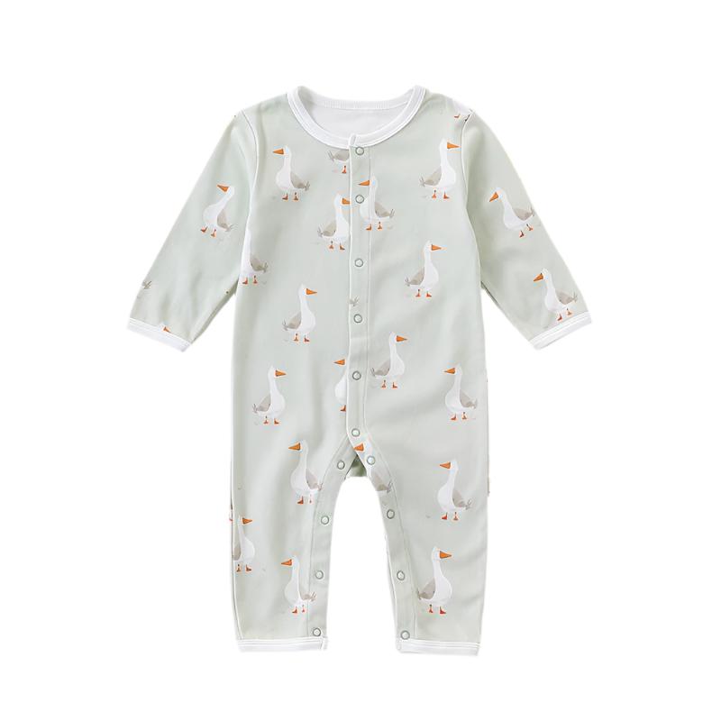 Made from soft, breathable cotton, this romper features a playful goose print and cozy long sleeves, perfect for any season. It’s easy to slip on and off with snap buttons along the crotch for hassle-free diaper changes.