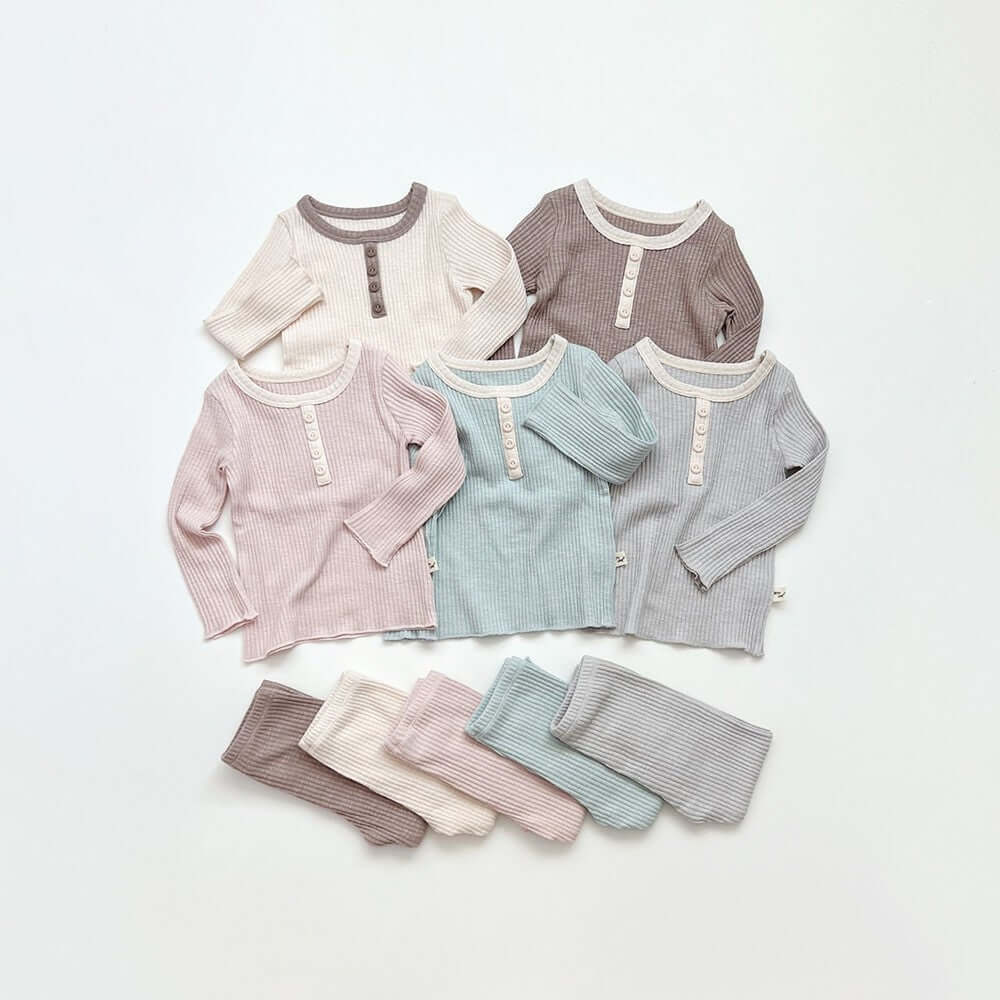 Featuring a quarter button Henley-style top and matching pants, this set offers a snug fit that’s perfect for lounging or bedtime. Available in five soft colors, this outfit is designed to keep your baby comfortable all day and night.