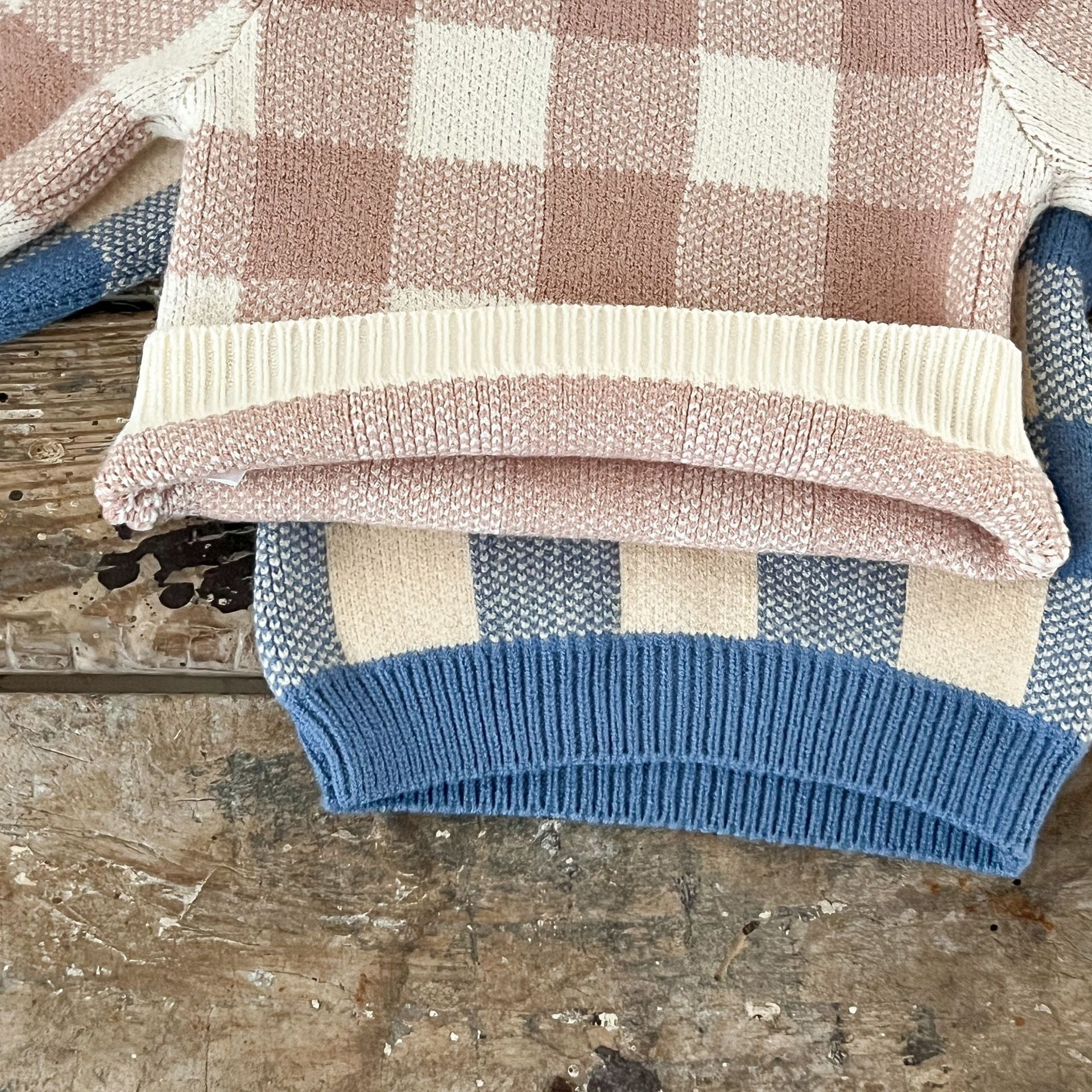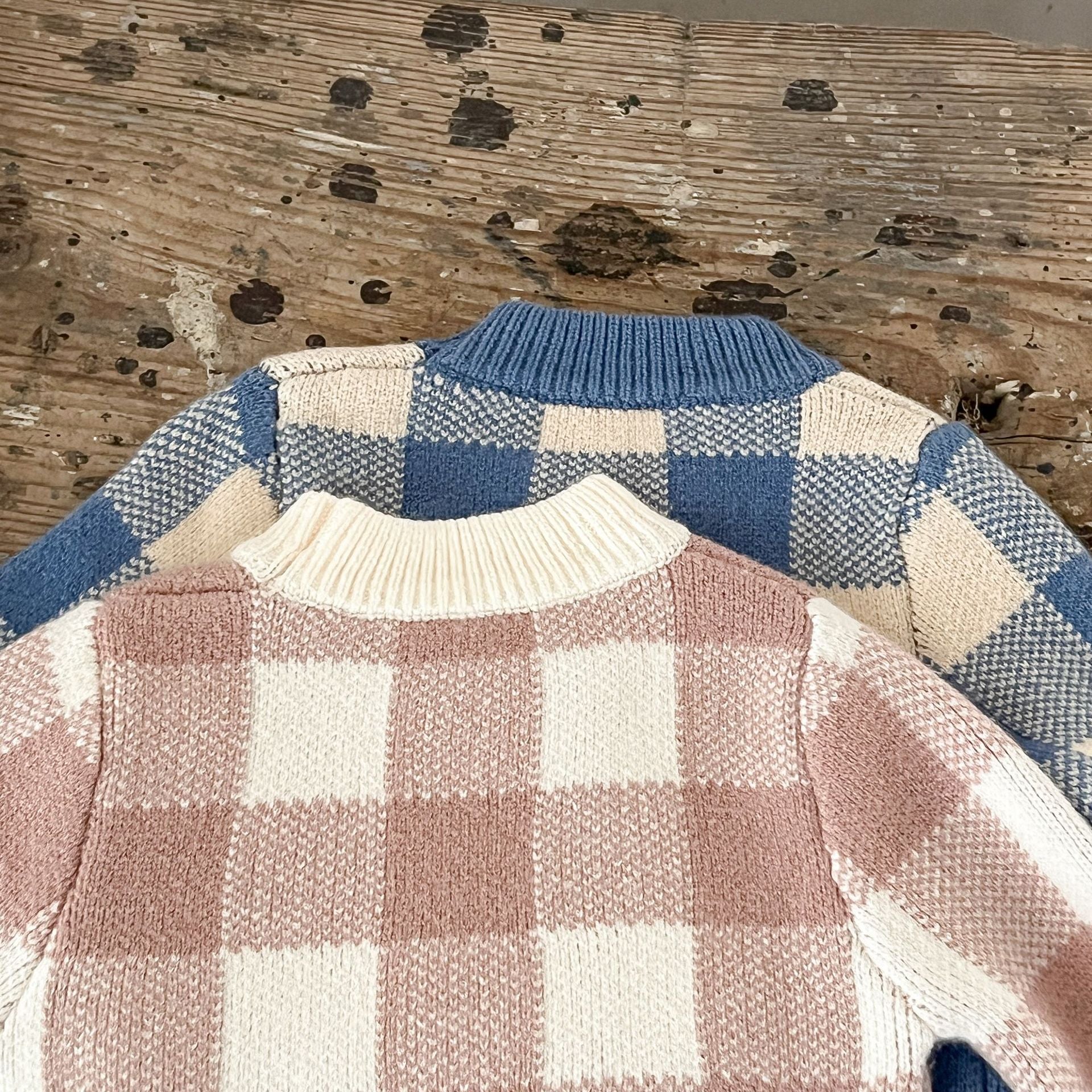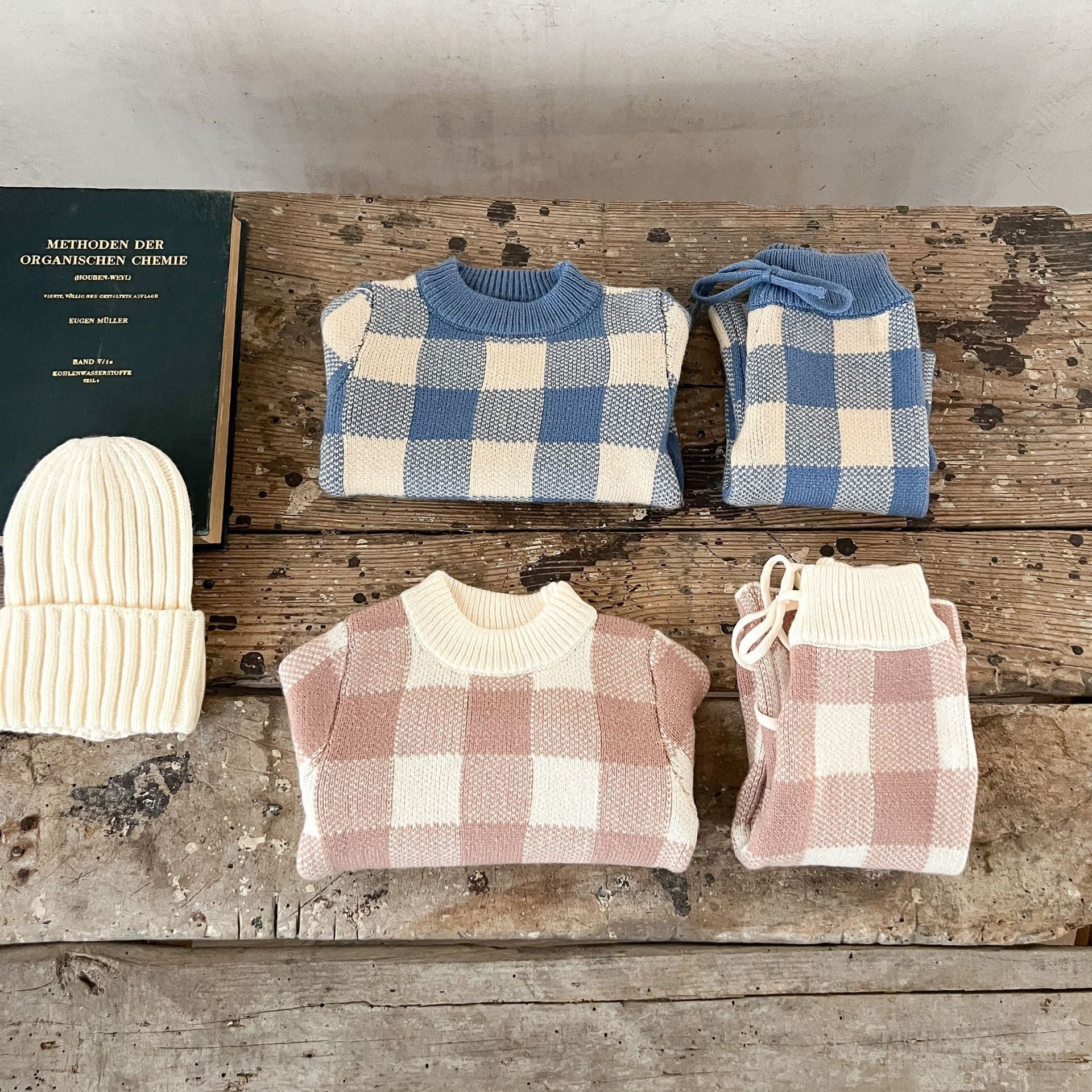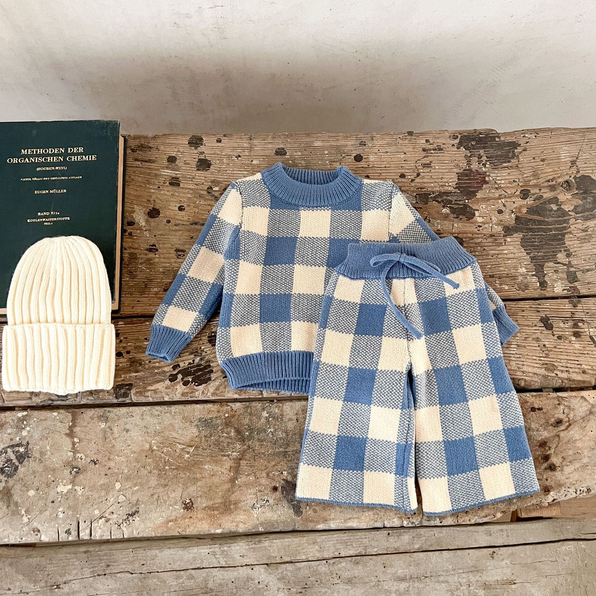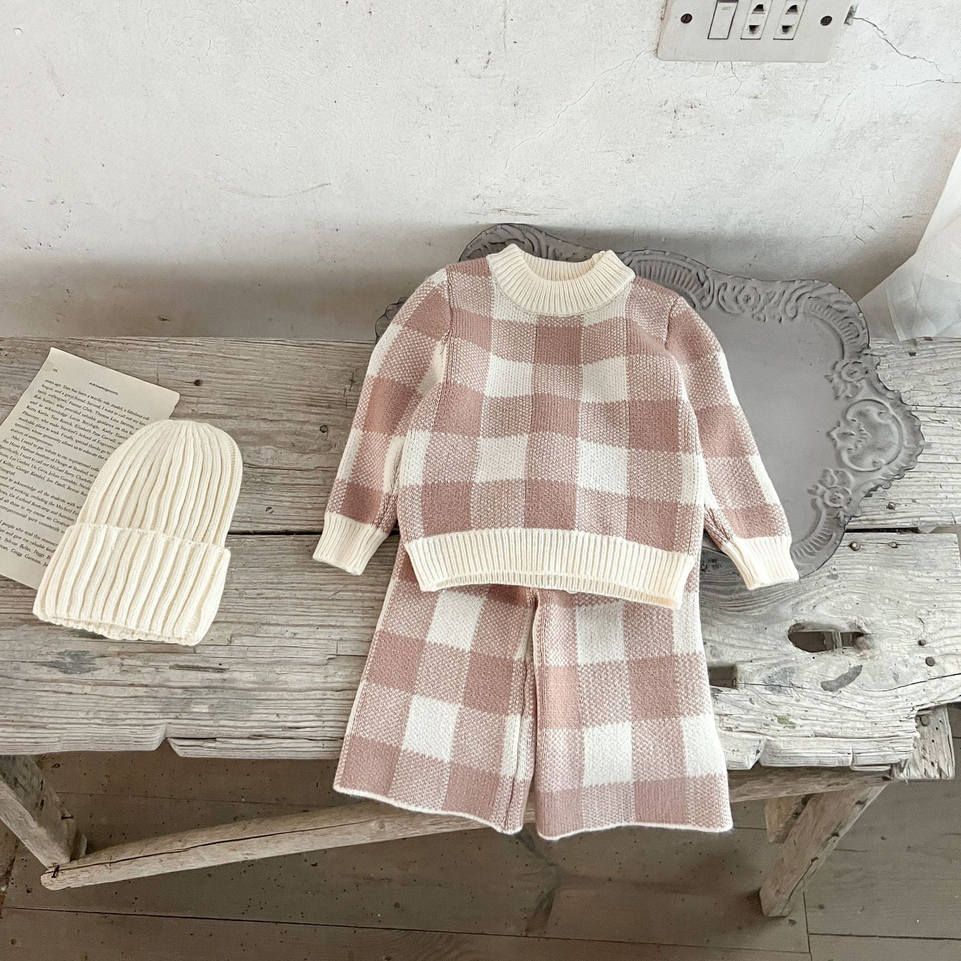 This cozy 2-piece knit set is a must-have for your little one. Featuring a pullover long sleeve sweater and matching wide-leg pants, it's both stylish and comfortable for all-day wear. Available in two charming checkered patterns, it's perfect for playdates or casual outings.