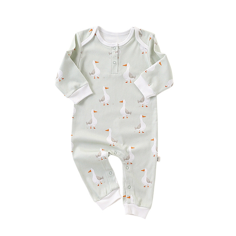 Made from soft, breathable cotton, this romper features a playful goose print and cozy long sleeves, perfect for any season. It’s easy to slip on and off with snap buttons along the crotch for hassle-free diaper changes.