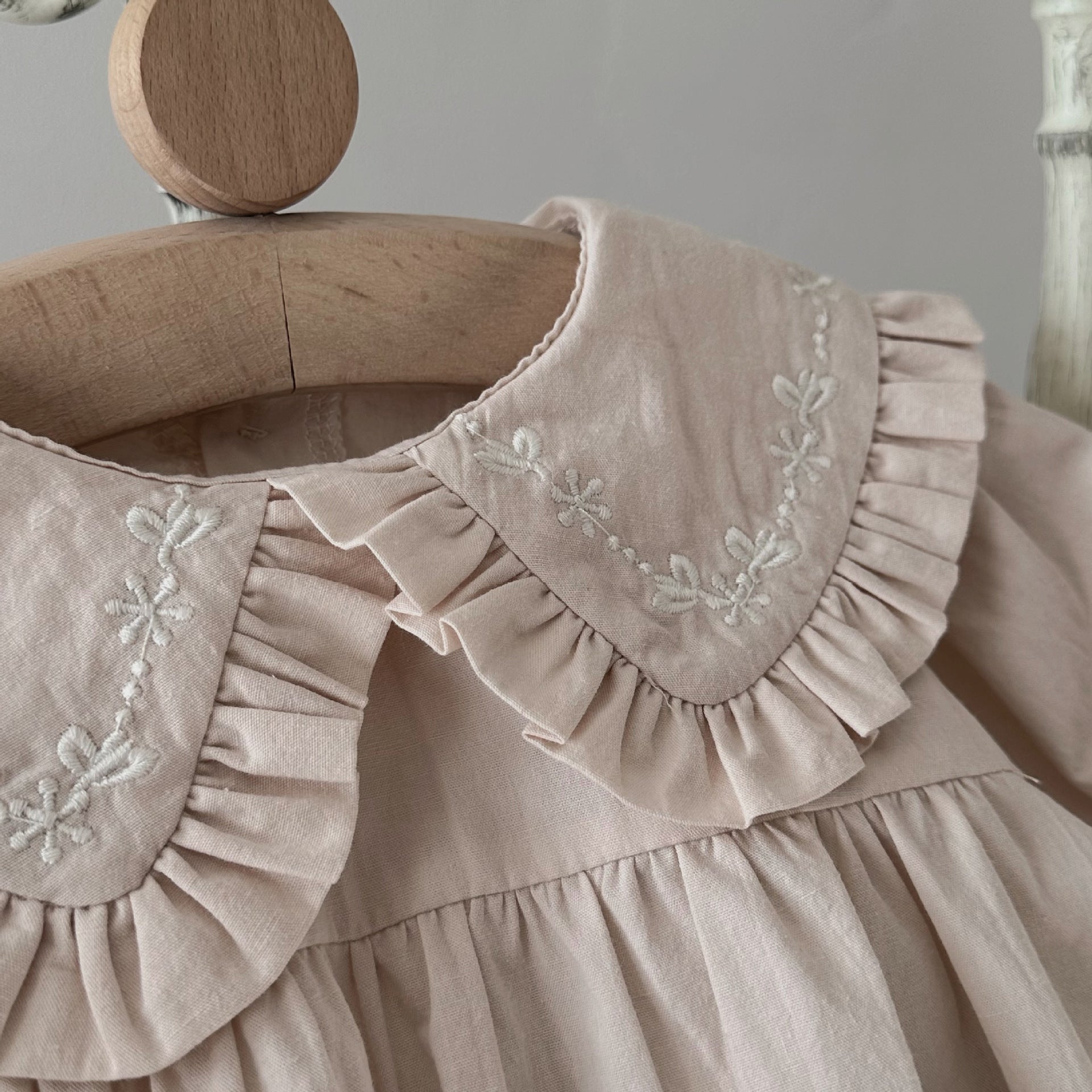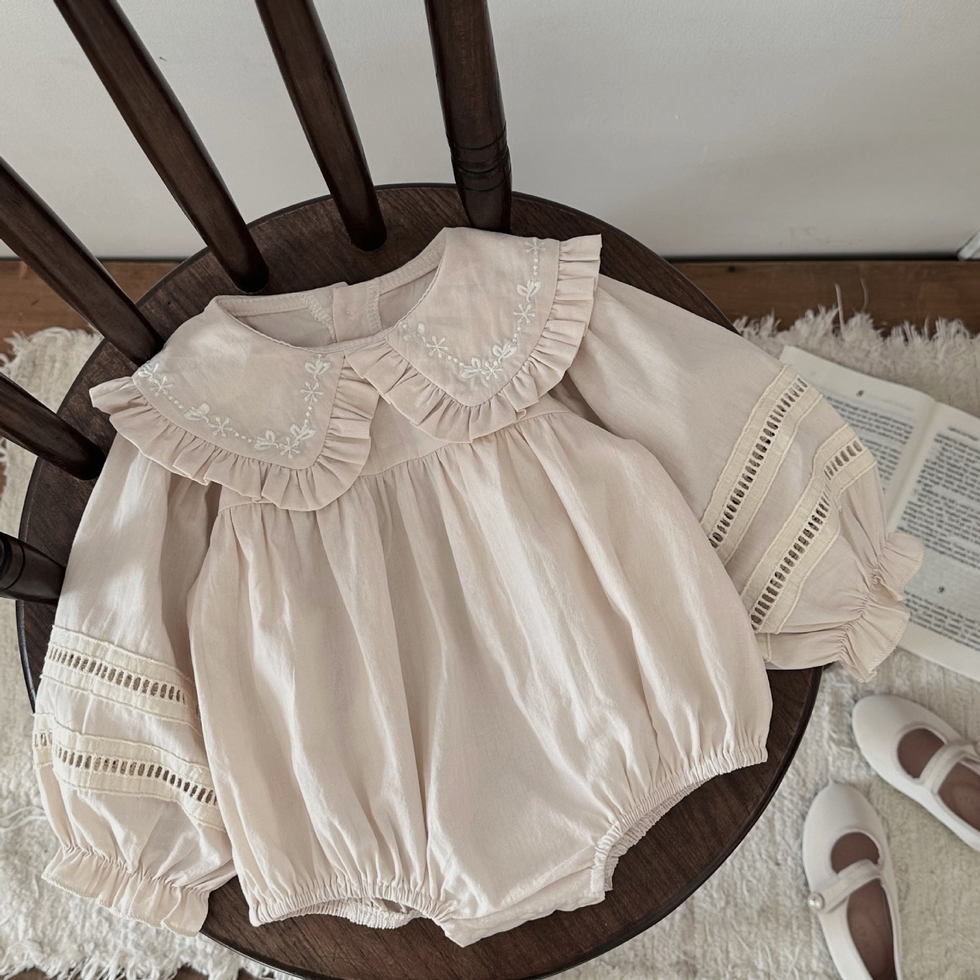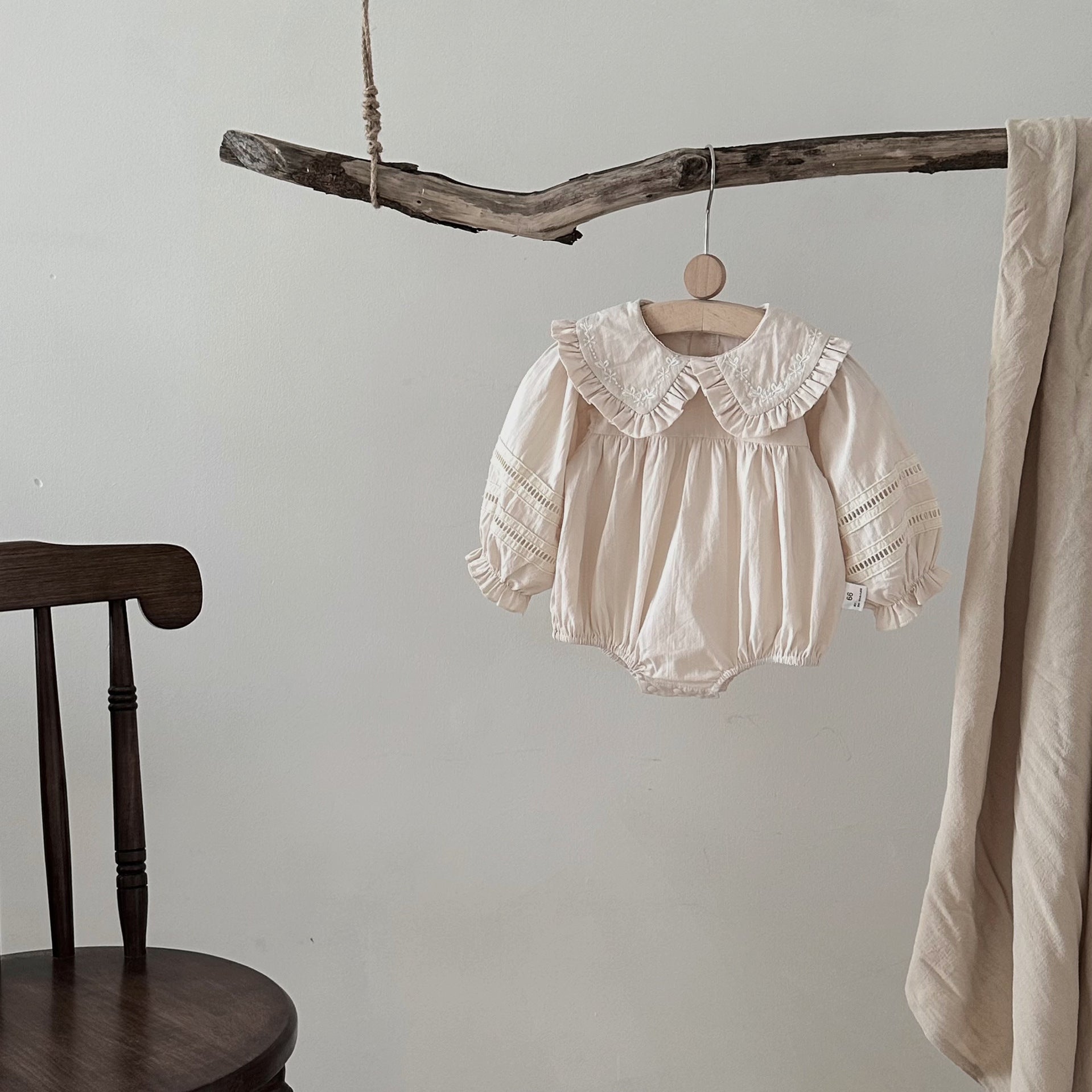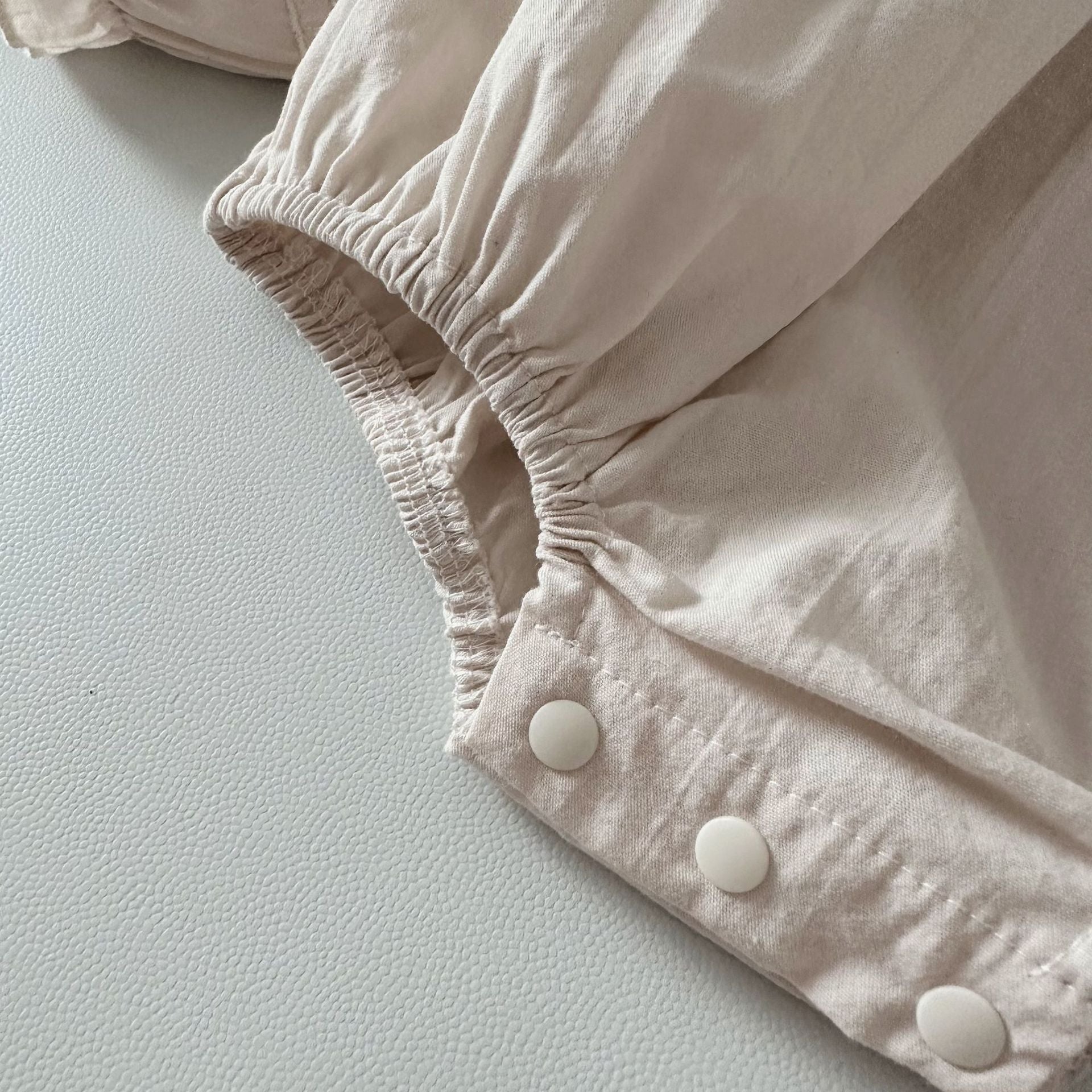 Introduce your little one to timeless elegance with this soft, breathable cotton-linen romper. The long sleeves and minimalist design make it ideal for year-round wear. Featuring a delicate natural texture, this romper combines simplicity with style for any occasion. Snap closures at the crotch ensure easy diaper changes.