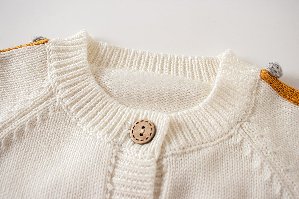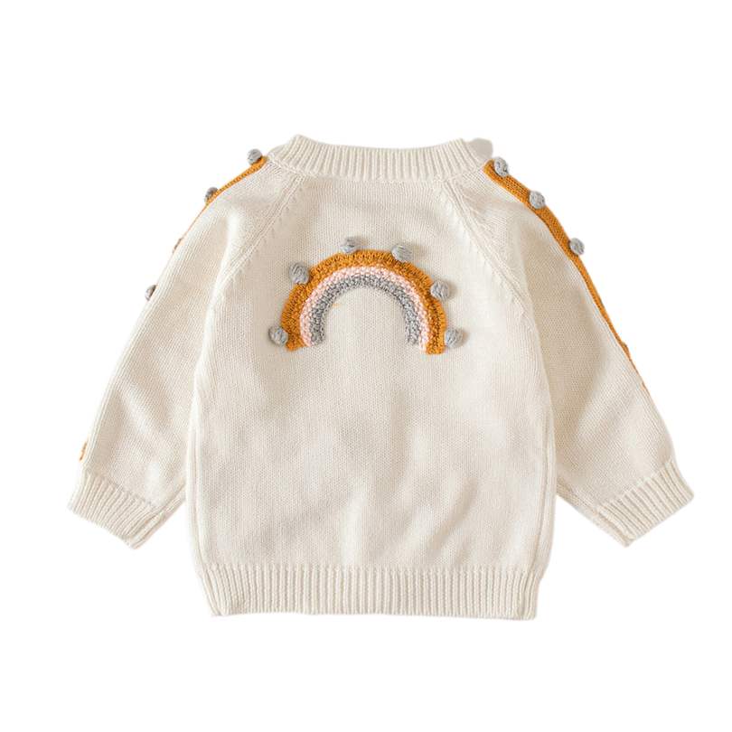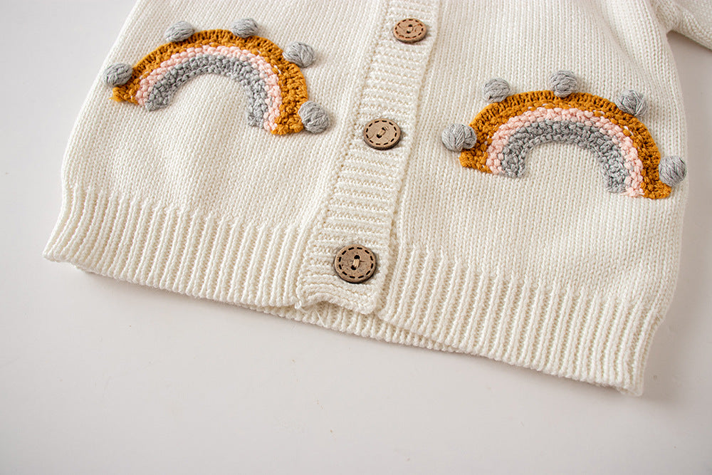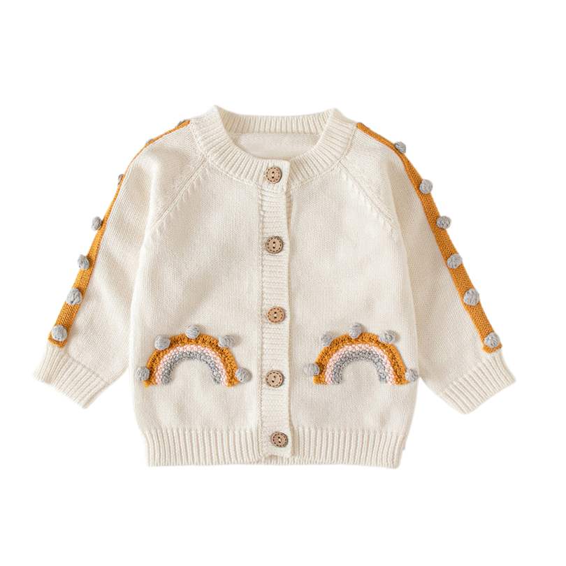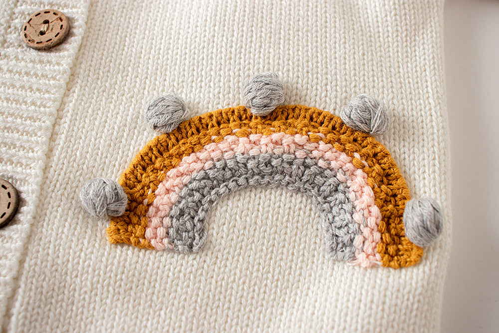 Our cozy knit cardigan is perfect for cooler weather! It features wooden buttons, rainbow embroidery on the pockets, and playful pom-poms along the sleeves. Made from soft 100% knit cotton, it's as comfortable as it is stylish.