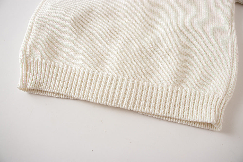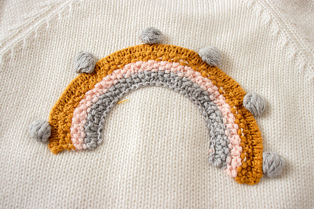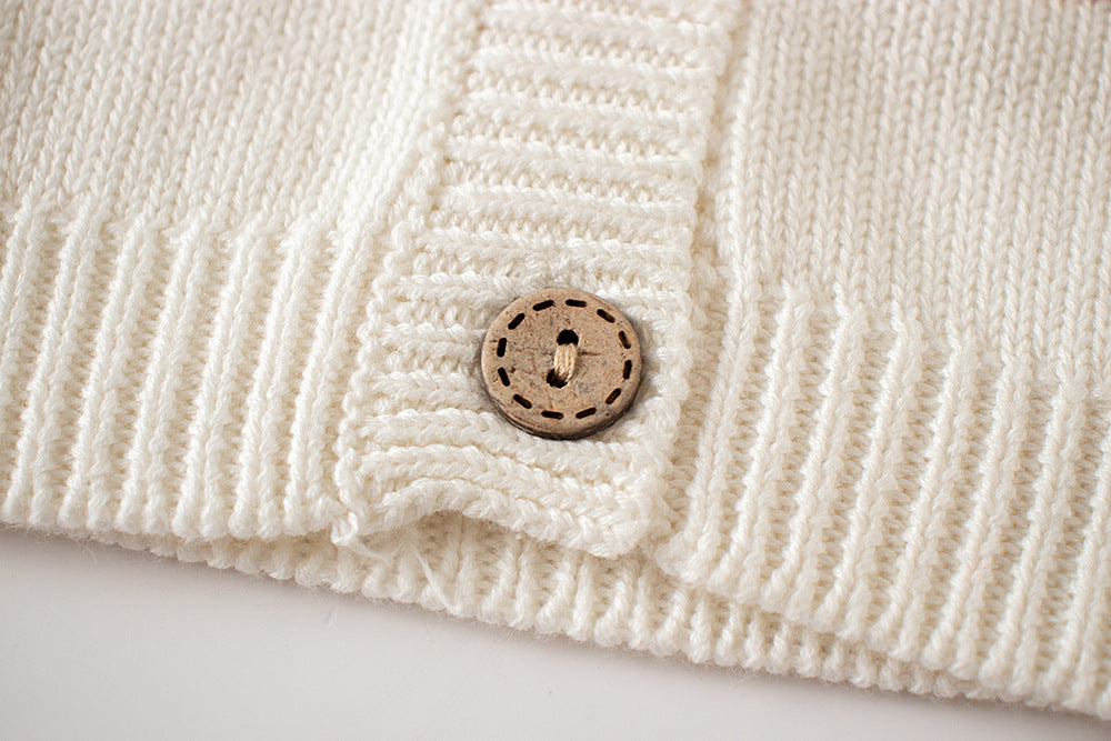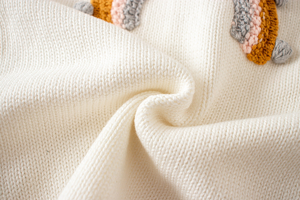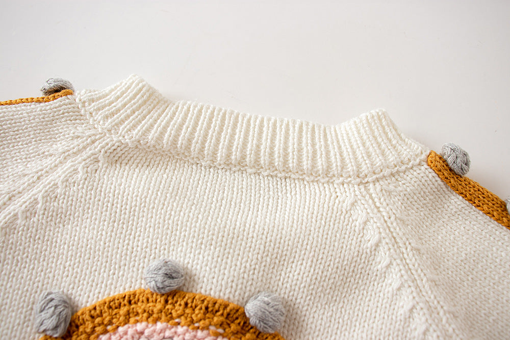 Our cozy knit cardigan is perfect for cooler weather! It features wooden buttons, rainbow embroidery on the pockets, and playful pom-poms along the sleeves. Made from soft 100% knit cotton, it's as comfortable as it is stylish.