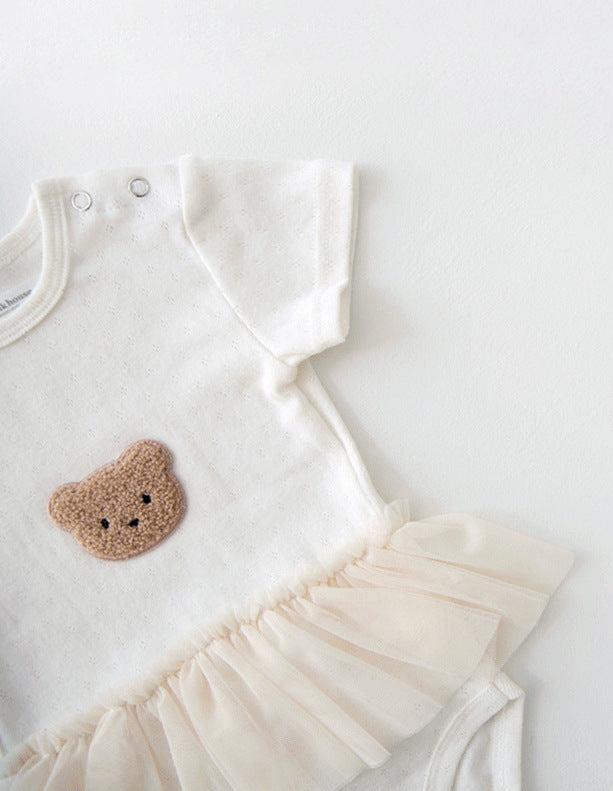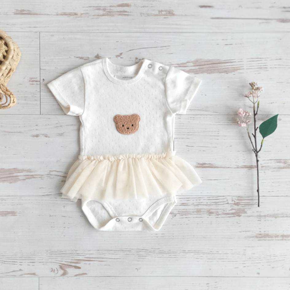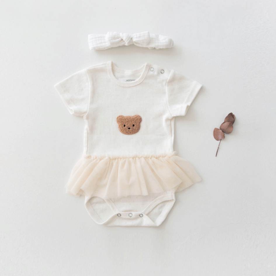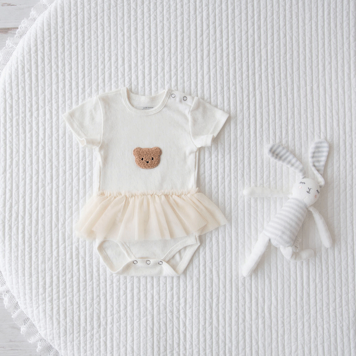 This adorable Teddy Tutu Bodysuit features a sweet teddy bear face applique on the chest, adding a playful charm to this cozy outfit. Designed with a delicate tulle tutu skirt attached to the bodysuit, it's perfect for creating a darling look for your little one. The soft, breathable cotton fabric ensures all-day comfort, while snap closures at the crotch make diaper changes a breeze.